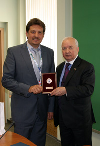 На фото: председатель Общероссийского профсоюза работников связи Анатолий Назейкин вручил генеральному директорому ОАО "Связьинвест" Евгению Юрченко памятный знак профсоюза "За развитие социального партнерства"