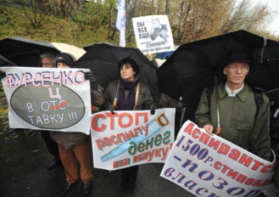По задумке лидеров профсоюза работников Российской академии наук, митинг, в задачу которого входило подвести итог ряда протестных мероприятий, состоявшихся за последний месяц в нескольких городах России, должен был пройти в Москве, напротив Белого дома. Правда, митингующих и народных избранников разделяла бы река, но так у ученых хотя бы оставалась надежда быть увиденными из правительственной обители. Префектура Западного административного округа столицы решила по-другому. Сославшись на закон "О собраниях, митингах, демонстрациях, шествиях и пикетированиях" (однако не приведя конкретной причины), акцию запретили проводить там, где планировалось, "слегка" передвинув мероприятие так, чтобы оно оказалось примерно в равной удаленности ото всех станций метро и сколько-нибудь посещаемых общественных объектов. И все же, несмотря на отдаленное место проведения, не лучшие погодные условия, а также почтенный возраст большинства участников, акция протеста собрала 21 октября на набережной Тараса Шевченко более 200 человек. Большинство из них - ученые, решившие высказать свое недовольство отношением правительства к фундаментальной науке. Впрочем, присутствовали на мероприятии и представители различных политических партий, а также люди из общественных организаций, поддерживающие работников РАН.