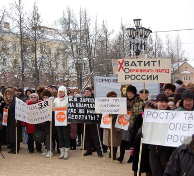 В полдень 26 февраля вся центральная площадь Бокситогорска (Ленинградская обл.) была заполнена людьми. Многие приходили семьями - рабочие-металлурги, дедушки и бабушки в валенках и теплых ушанках, внуки с плакатами. Надписи на плакатах красноречиво говорили о том, что творится с тарифами: "Стоп грабительским тарифам!", "Беспределу - нет!", "Всю зарплату - на квартплату, где же наши депутаты?!", "Металлург терпелив, но взрывоопасен!", "Повышайте сначала зарплату, а потом - квартплату!", "Промолчишь - жизнь пройдет, защищай себя, народ!"