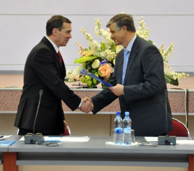 Заместитель председателя МФП Юрий Павлов вручает приветственный адрес генеральному директору УИЦ МФП Владимиру Богдашину