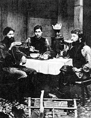 Трактирные половые, то есть официанты, чинно, с самоваром трапезничающие во время обеденного перерыва - ни больше ни меньше как постановочная, "бытописательско-рекламная" фотография, лишь отчасти отражающая реалии рубежа XIX - XX веков... Фоторепродукция ИТАР-ТАСС