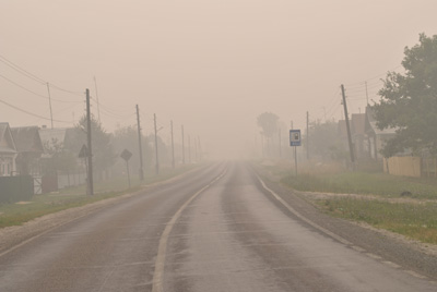 Езда на мотоцикле "Урал" по окрестностям поселка напоминает учения кавалеристов. То яма, то щебенка, то дерево поперек дороги, то глубокий песок, - все что угодно, кроме ровного пути. По обе стороны уже давно тянется выгоревший березовый подлесок, земля дымится. За деревьями все тот же белесый туман. Юрий объясняет, что недавно здесь был глухой лес, а теперь деревья частью сами повалились от огня, а часть для профилактики срубили МЧСники. Одна-две пожарные машины мелькают в глубине леса. К ним по дороге протянуты металлические трубы. Юрий поясняет, что эти трубы - "подарок" от Минобороны, так как на свои средства столь оперативно наладить подачу воды к месту пожара поселок был бы не в состоянии.