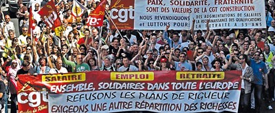 В первый день акции по всем крупным городам страны прошли массовые митинги и демонстрации, организованные Confederation General du Travail (CGT) и другими профцентрами страны. По данным профсоюзов, на улицы вышли более 3 млн человек, хотя официальные власти сообщают лишь о миллионе протестантов. Только парижская манифестация может похвастаться рекордной явкой 330 тысяч человек. За один день город оказался с ног до головы оклеен плакатами, листовками и стикерами, призывающими всех и каждого бороться за свое будущее. "Мы имеем право на пенсию", "Пенсия в срок!", "Саркози на пенсию сегодня!" - гласят послания.