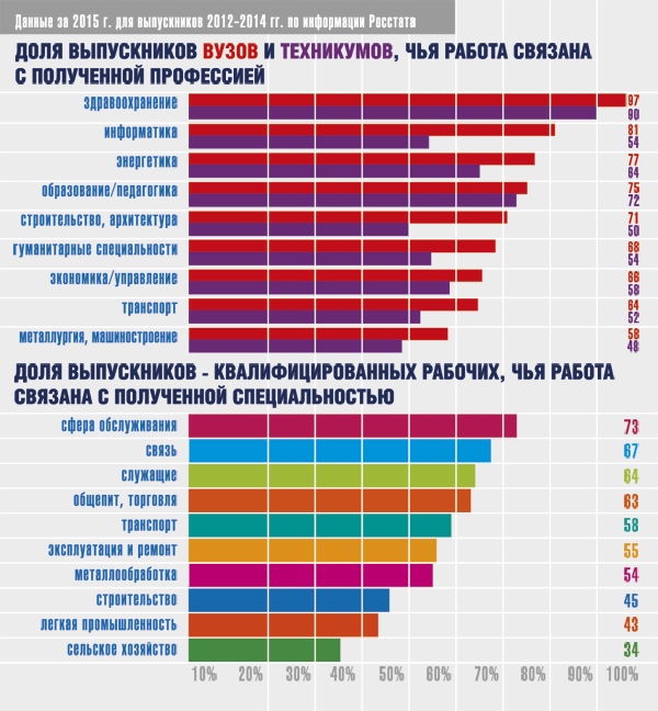 Впрочем, далеко не все выпускники работают по профессии. Чаще всего диплом “пригождается” студентам медицинских учебных заведений. Реже всего по профессии (не больше половины) идут работать выпускники сельскохозяйственных образовательных учреждений. Во многом это происходит потому, что абитуриенты имеют не совсем реалистичное представление о том, какие профессии востребованы.
