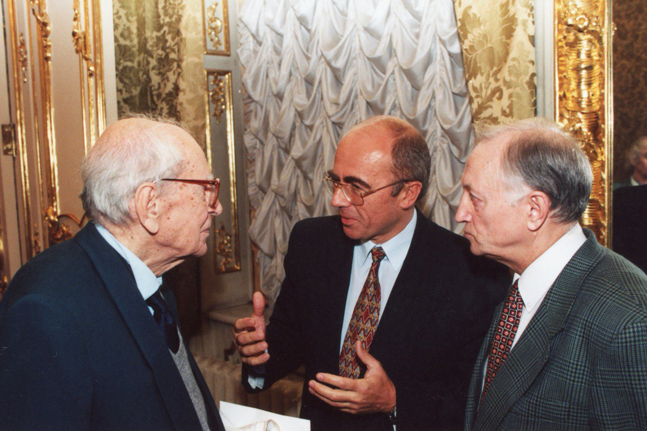 На фото - академик Дмитрий Лихачев, Александр Запесоцкий и Владимир Триодин