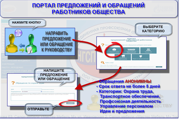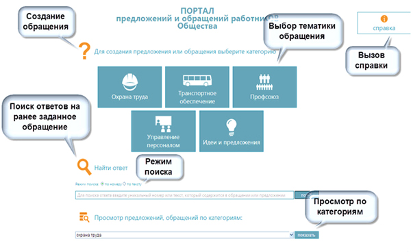 Для создания предложений или обращений портал имеет 6 категорий: охрана труда; транспортное обеспечение; профсоюз. управление персоналом; идеи и рационализаторские предложения.