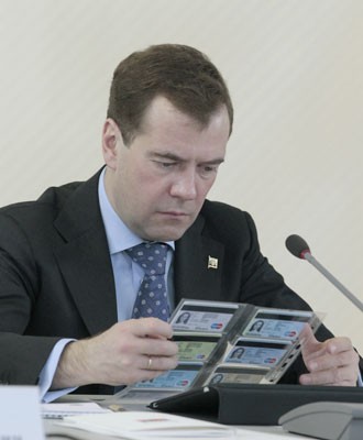 28 февраля 2011 года. Дмитрий Медведев с образцами универсальных карт на заседании комиссии при президенте РФ по модернизации и технологическому развитию экономики РФ. Фото ИТАР-ТАСС