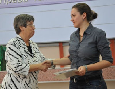 На фото: зампред МФП Тамара Чернякова вручает почетную грамоту одному из перспективных молодых педагогов
