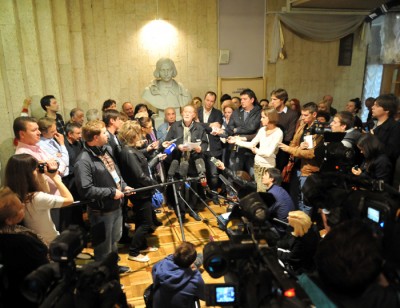 На собрании произошло сразу два неожиданных для прессы и самих участников события. Во-первых, прямо во время общения с журналистами Анатолию Бейраку передали факс с обращением Кирилла Серебренникова в адрес бунтующих артистов, в котором он пригрозил, что “если вы сейчас начнете драться с ОМОНом или нарушать закон другим способом, лучше не станет”. Суть в том, что коллектив культучреждения сначала хотел провести стихийный митинг у входа в театр, но затем, с разрешения администрации, переместился в театральное фойе, так как на улице их уже ждал полицейский автобус.